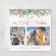 Our First Christmas Photo Card. This design features a watercolor illustrations of greenery foliage and red berries. Text "our first christmas" is written in calligraphic style. Place your photos below to complete.