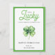 Green Four Leaf Clover Luck Happy St Patricks Day Holiday Card features a green and white colour scheme with green four-leaf clover against a white background. The colourful "Lucky" script and black "Happy St. Patrick’s Day" text bring festive cheer. The backside is filled with a charming four-leaf clover pattern for added detail.
