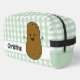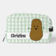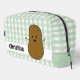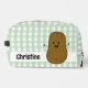 Adorable toiletry bag featuring a cute happy cartoon brown potato. The background is a cute classic pattern of green and white gingham. A template to add your name to personalise.
