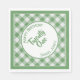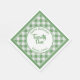 Personalise this napkin with your text, name, and age using the text templates supplied. The simple, geometric design in the background is a green and white, classic, gingham checks pattern with a square frame and a circle for your text. A great idea for your next birthday party, family picnic, or backyard BBQ. This design is suitable for all occasions or celebrations; just change the text to match the event.