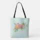 All over print tote bag done in a mint green and white gingham checked pattern, with watercolor graphics of a colourful peony floral bouquet. Customise to add your own text to this pretty all purpose bag.
