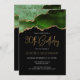 This trendy birthday invitation features a watercolor image of an agate geode in shades of dark, medium, and light green, with faux gold highlights. The words "90th Birthday" appear in faux gold glitter in decorative modern handwriting font. Customise it with the name of the guest of honour in gold art deco font and the party details in white sans serif type. The same green agate image appears on the reverse side.