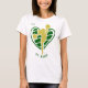 Here's a t-shirt suited for individual members of a cheerleading squad. A gold silhouette cheerleader with pom poms is in front of a green pattern heart. Your custom text is at the bottom, and her name is at the top left. A thoughtful keepsake gift for a special time in their lives! *If you need a different colour scheme, message our store and we will try to accommodate!