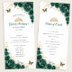 Emerald green, gold and white Quinceanera celebration program. Slim double sided order of events card. Features, script font, gold butterflies, watercolor roses and tiara. Perfect for an elegant princess style glam celebration. Personalise with your own details. Printed Zazzle invitations or instant download digital printable template.