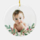 Baby Baptism photo ornament - This design features an illustration of green and golden foliage, red berries in watercolor style. On the reverse side - you can place your photo