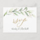 Elegant RSVP Postcard with a watercolor illustration of green and gold foliage.