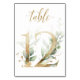 Beautiful table number card with a botanical motif - a watercolor illustration of green and gold leaves. Table 12. Please, check all available numbers