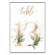 Beautiful table number card with a botanical motif - a watercolor illustration of green and gold leaves. Table 13. Please, check all available numbers