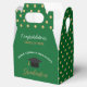 This green and gold custom senior graduation party favor box features chic white and gold typography under a high school or college name for the class of 2026. Customize with your graduating year under the lovely congratulations calligraphy for a great personalized graduate ceremony decoration. Classy polka dots decorate the sides.