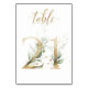 Beautiful table number card with a botanical motif - a watercolor illustration of green and gold leaves. Table 21. Please, check all available numbers