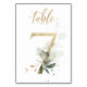 Beautiful table number card with a botanical motif - a watercolor illustration of green and gold leaves. Table 7. Please, check all available numbers