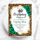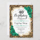 40th Birthday Party Invitation. Elegant floral emerald green design with faux glitter gold and roses. Features leopard cheetah animal print and script font. Perfect for a stylish womens bday celebration. Can be customised for any age! Printed Zazzle invitations or instant download digital printable template.