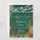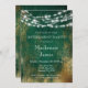 A hip emerald green retirement party invitation featuring a faux metallic distressed background with hanging lights.