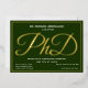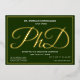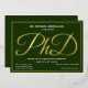 A PhD graduation party invitation with gold foil, white text, and a green background. Simply add your information, add this invitation to your cart, and celebrate this major accomplishment.