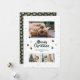 Modern green and gold photo Meowy Christmas card featuring three photos, snow and paw prints on the front and a paw prints background at the back. Easily personalize this cute photo Christmas card with your photos, family name and the year.