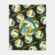 This sporty volleyball team spirit fleece blanket for girls features a large green, gold and white artsy, stylised volleyball, upon which her name and jersey number can be personalised, overlying a pattern of smaller green, gold and white volleyballs and the sporty font text "I love volleyball" that stretches between the angled rows of volleyballs - background is customisable black - by katz_d_zynes