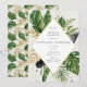 This wedding invitation features green watercolor tropical palm, banana and monstera leaves and simulated gold foliage. It has a matching pattern back. Trendy geometric backgrounds with hexagons, circles and diamonds with simulated gold accent borders. This collection has wedding invitations, save the dates, rsvps, menus, and labels. Great for summer, destination, and beach weddings!