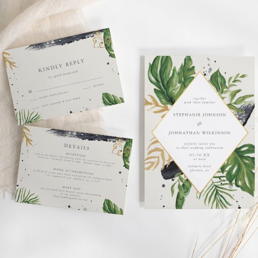 This invitation has green watercolor tropical leaves and simulated gold foliage. The copy is fully editable. You can also change the font. Add the bride & groom's name.