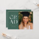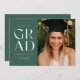 Celebrate your graduation in style with this modern green and white graduation announcement and invitation. It features the word GRAD in stylish sans serif on a forest green coloured background on the front, along with space for a photo. The back of the invitation has space for a second photo as well as room for all of the details of your graduation party.