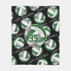 This sporty volleyball team spirit fleece blanket for girls features a large green, grey and white artsy, stylised volleyball, upon which her name and jersey number can be personalised, overlying a pattern of smaller green, grey and white volleyballs and the sporty font text "I love volleyball" that stretches between the angled rows of volleyballs - background is customisable black - by katz_d_zynes