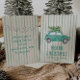 If you are looking for a simple minimalist beautiful and easy editable Christmas card. This one is perfect for you. And as you see the design features a vintage green car truck with a tree, And beige and green hand written typography of MERRY CHRISTMAS. And your family name and year under it. And In the back you got a a customisable Christmas greeting paragraph and colourful lights stripe. All on cream and green stripes background.
