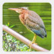 A bird with a long beak stands perched on a metal railing, next to a chain-link fence and greenery, with a serene body of water in the background. The scene is vibrant with lush foliage and reflections in the water.
