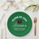 A classy custom class reunion party paper plate in green and white for a high school, college, or university. Customise with your school name and graduating class under the elegant calligraphy for great personalised alumni celebration decor.