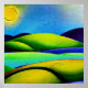 Digital watercolor landscape design in vibrant shades of blue, green, and yellow with a sun and birds.