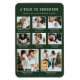 Green Holiday Photo Magnet. Elevate your heartfelt sentiments with our chic 'A Year To Remember' personalised photo holiday magnet card. This stylish keepsake, featuring a vintage typewriter font and space for 8 family photos is a perfect blend of nostalgia and style. White text on a green background. Personalise and make your memories timeless!