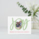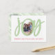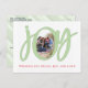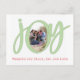 This cute and whimsical design features Christmas holiday joy, fun one photo, red and green, a modern typography, an elegant brush script, cute green stripes, whimsical, a budget-friendly postcard, holiday photo card, with bold lettering