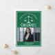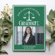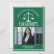 This custom green law school graduation announcement card features white typography for a class of 2024 graduate above your student photo. Customise with your graduating year under the scales of justice and photograph for a great personalised lawyer or attorney card.