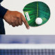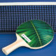Ping pong paddle with a closeup photo of a green tropical leaf displaying some vibrant palm fronds.