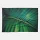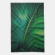 A kitchen towel with a closeup photo of a green tropical leaf displaying some vibrant palm fronds.