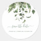 This modern Save the date sticker features your names and wedding date with pretty green leaves botanical border and "Save the Date" written in a matching green elegant script.