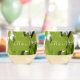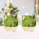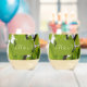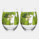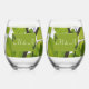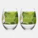 A perfect reminder of your perfect day with these stemless wine glasses with beautiful rich green in tones and tree leaves in sunlight.