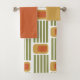 This towel set has a yellow washcloth, an orange hand towel, and a bath towel with a mid-century modern design made of five green lines and a gold rounded rectangle with an orange rounded rectangle repeated across the design.