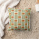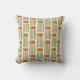 This throw pillow has a mid-century modern design made of five green lines and a gold rounded rectangle with an orange rounded rectangle repeated across the design.