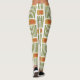 These leggings have a mid-century modern design made of five green lines and a gold rounded rectangle with an orange rounded rectangle repeated across the design.