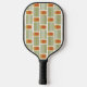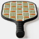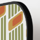 This pickleball paddle has a mid-century modern design made of five green lines and a gold rounded rectangle with an orange rounded rectangle repeated across the design.