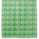 This shower curtain has a mid-century modern design of green vertical lines with rectangles above, repeated over the design.