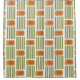This shower curtain has a mid-century modern design made of five green lines and a gold rounded rectangle with an orange rounded rectangle repeated across the design.