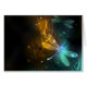 Flight of glowing, green, artistically drawn dragonfly with transparent green and yellow wings on glowing night background with marsh plants and fireflies. Glowing dragonfly.