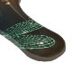 Flight of glowing, green, artistically drawn dragonfly with transparent green and yellow wings on glowing night background with marsh plants and fireflies. Glowing dragonfly.