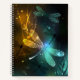 Flight of glowing, green, artistically drawn dragonfly with transparent green and yellow wings on glowing night background with marsh plants and fireflies. Glowing dragonfly.
