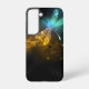 Flight of glowing, green, artistically drawn dragonfly with transparent green and yellow wings on glowing night background with marsh plants and fireflies. Glowing dragonfly.