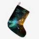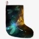 Flight of glowing, green, artistically drawn dragonfly with transparent green and yellow wings on glowing night background with marsh plants and fireflies. Glowing dragonfly.