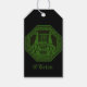 Celtic lyre harp badge style graphic in green on black background. Customise gift tag with name or monogram
