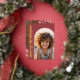 Add a vertical photo and family name to this Christmas photo card. The photo is in a trendy arch with a gold border.