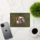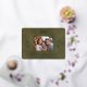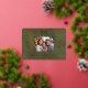 A festive bow and botanical branches in gold foil will set off your family holiday photo beautifully. Below the photo, the words "Merry Christmas!" appear in elegant and clear typography above a template for your family name. The green leather print background sets off the foil and makes the postcard feel luxurious. The back of the postcard is a beige leather print for another special touch.