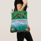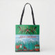 Green background Merry Christmas Train Tote Bag with the little Scotty dog riding along.